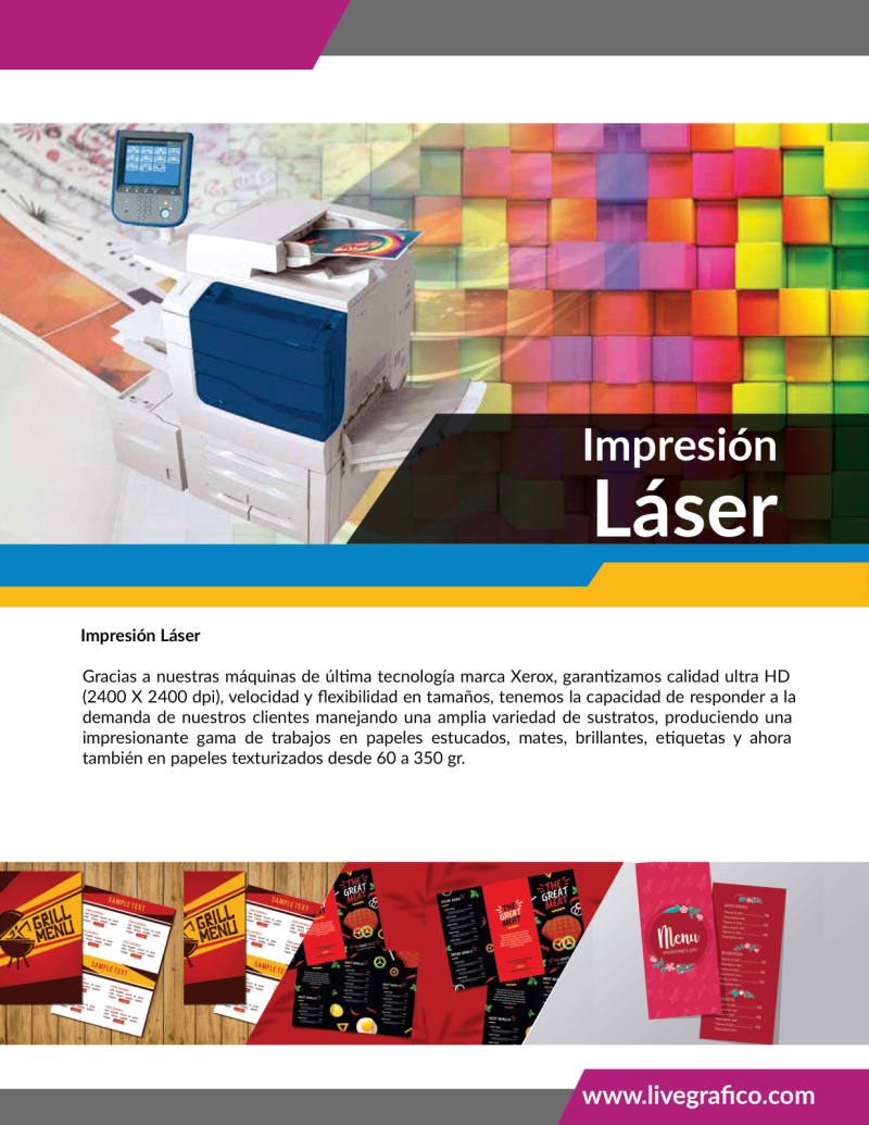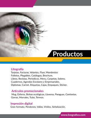 Tarjetas, Facturas, Volantes, Flyer, Membretes Folletos, Plegables, Catálogos, Brochure, Libros, Revistas, Periódicos, Menu, Carpetas, Sobres, Cuadernos, Agendas Escolares y Empresariales. Diplomas, Carnet, Etiquetas, Cajas, Empaques, Stíckers.