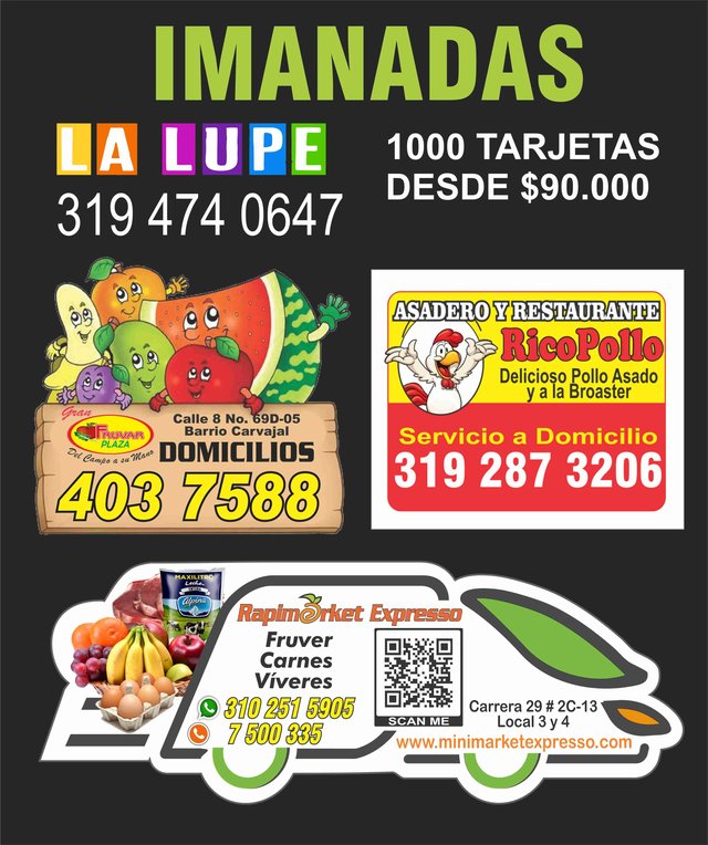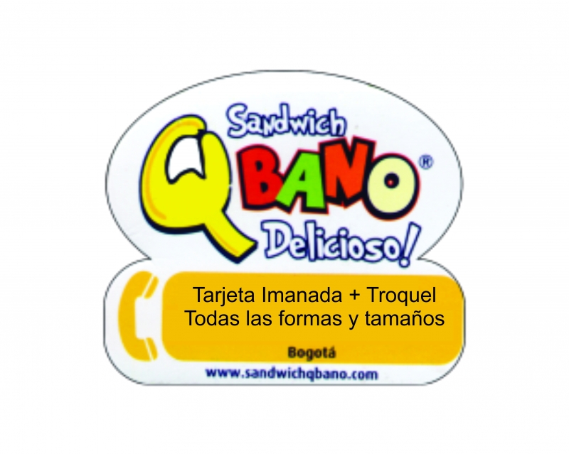 Tarjeta imantada ideal para servicios de domicilios. A todo color en iman calibre 0.3. Tamaño 5,4x5,4.Diseño íncluido. Otros tamaños: 5,4x6 cm. 5,4 x 9 cm. Tarjeta Troqueladas.